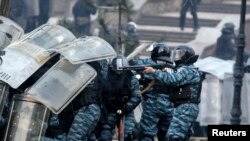 В Киеве продолжаются столкновения между демонстрантами и стражами порядка. Однако таких ожесточенных стычек, как накануне вечером и ночью, пока не наблюдается. Демонстранты время от времени бросают камни в спецназовцев, а, они, в свою очередь отвечают светошумовыми гранатами и гранатами со слезоточивым газом.