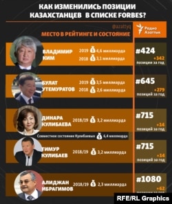 Пятерка казахстанских миллиардеров улучшила позиции в списке богатейших людей мира, ежегодно составляемом американским журналом Forbes. Совокупное состояние четы Кулибаевых — средней дочери и зятя президента Казахстана Нурсултана Назарбаева — издание оценило в 6,4 миллиарда долларов.