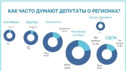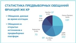 Нанакеева: Согласно нашему анализу, по выполнению обещаний на первом месте стоит фракция «Республика–Ата Журт». А если говорить о качестве данных обещаний, то на первом месте здесь идет СДПК. Есть и такие моменты. Например, «Республика-Ата Журт» дает обещания и старается их выполнять, но из-за того, что конкретных, четких обещаний мало, по этому показателю она отстает. Если говорить в общем, действующий VI созыв парламента - самый слабый по выполнению обещаний. Срок полномочий этого созыва завершается, и в осенью 2020 года состоятся выборы. На сегодняшний день парламент выполнил менее 20% данных обещаний.