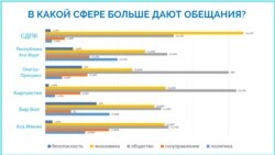Большинство обещаний трудновыполнимы. Например, жителям Нарынской области обещают, что сделают этот регион самым богатым или выведут Кыргызстан в число богатейших стран, искоренят бедность. Поедут политики на Иссык-Куль или в Талас, дают обещания, касающиеся всей страны. Очень мало конкретики. Например, пообещать талассцам добиться повышения цен на фасоль или иссыккульцам -   помочь в развитии туризма. Если обобщить, больше остальных обещаний дает фракция «Республика–Ата Журт». Более 21% ее обещаний связаны с регионами. На следующей позиции у нас фракция СДПК. 16-17% ее обещаний связаны с регионами. На третьем месте – фракция «Кыргызстан». Далее идут «Бир бол», «Ата Мекен». На самом последнем месте - «Онугуу-Прогресс».