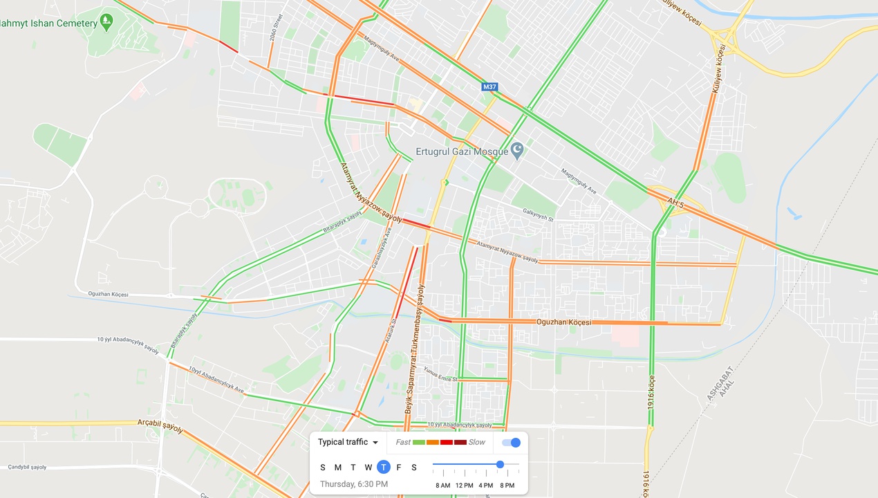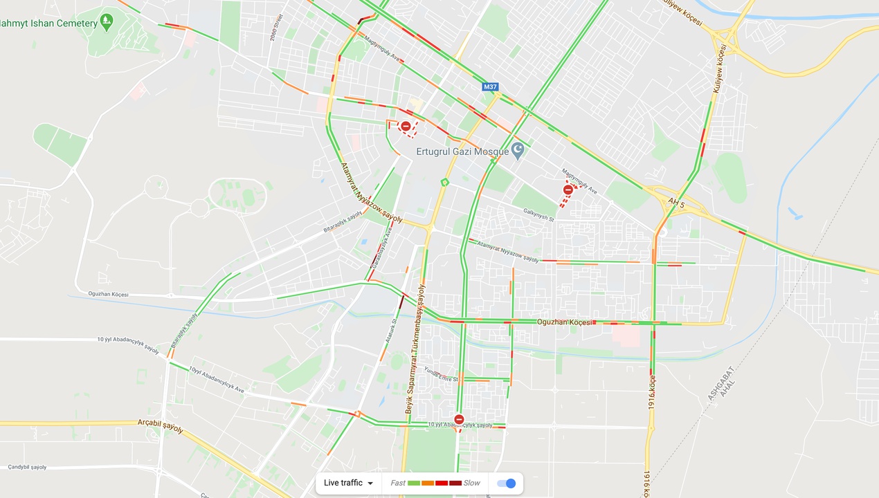Несмотря на значительные ограничения интернета в Туркменистане, сервис Google Maps получает достаточно данных о передвижениях пользователей по дорогам Ашхабада. Визуализация дорожной ситуации в городе свидетельствует о снижении активности автомобильного движения в столице Туркменистана. На некоторых улицах и вовсе не регистрируются передвижения пользователей сервисов Google.