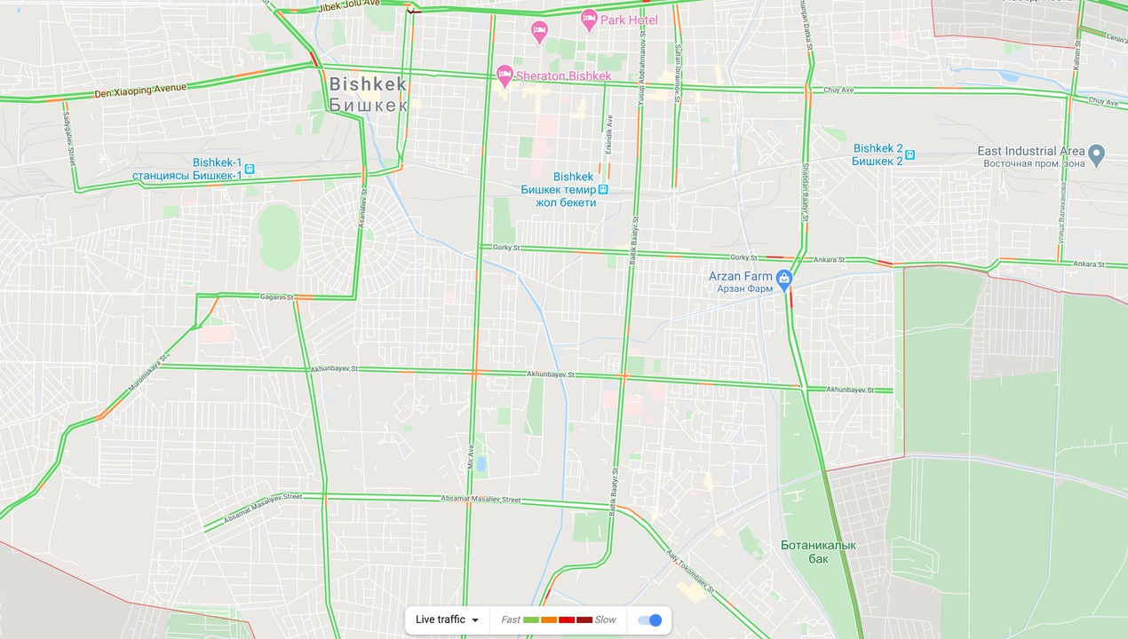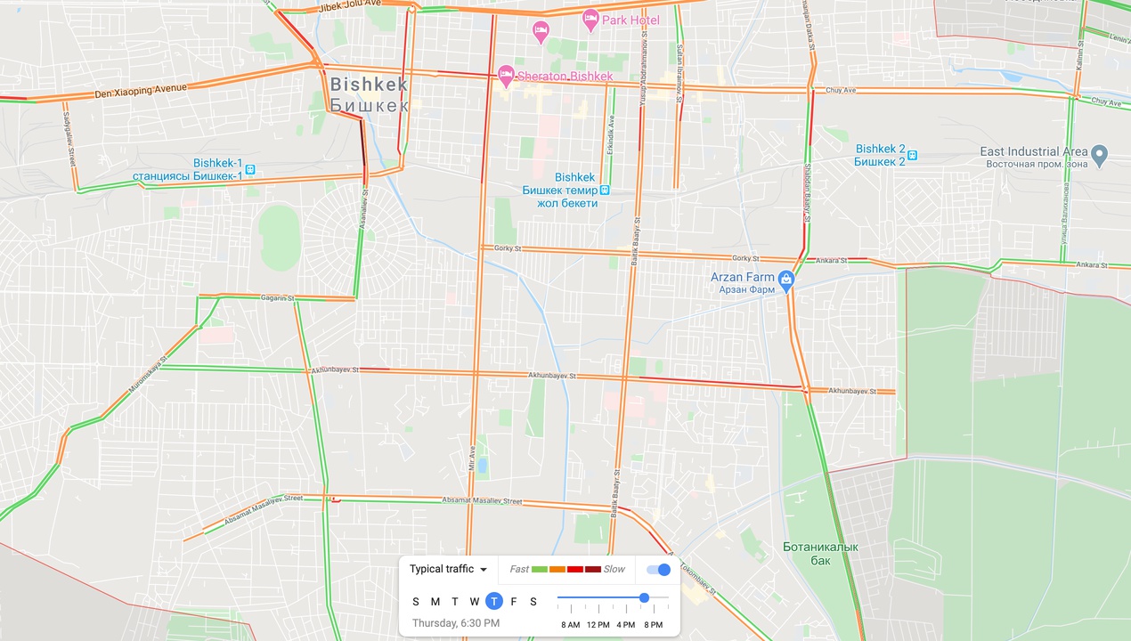 Наглядная иллюстрация этих процессов –​ резкое изменение ситуации на дорогах. Настоящее Время сравнило трафик в столицах республик бывшего Советского Союза в вечерний час пик до и после объявления пандемии на основе данных сервиса Google Maps. Для полноты картины мы также сравнили ситуацию в крупных городах мира с типично высоким уровнем трафика –​ Лиме, Маниле, Мумбаи, Стамбуле, Нью-Йорке и Париже.