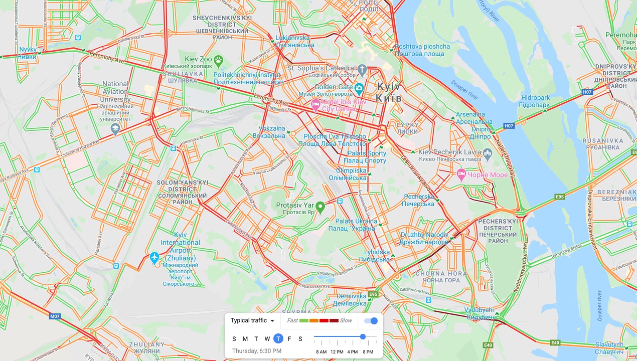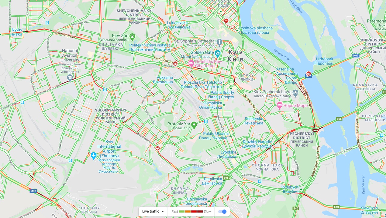 В Киеве основные пробки всегда были в центре на правом берегу Днепра, на Набережном шоссе, на проспекте Победы, на проспекте Степана Бандеры и на идущей через район Подол улице Нижний Вал. Также пробки были в окрестностях вокзала, где находятся три больших торговых центра.