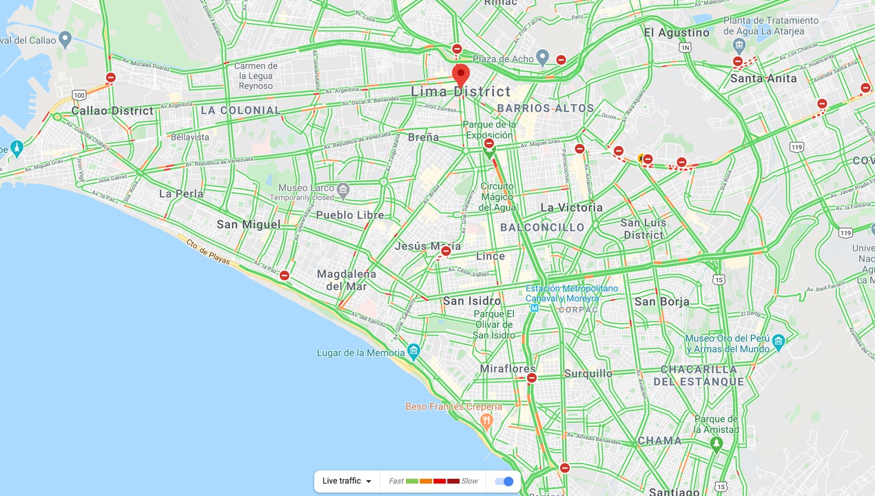 Интенсивность дорожного движения в Лиме заметно снизилась уже на следующий день после введения первых ограничений: 16 марта машин на улицах стало на 86% меньше.