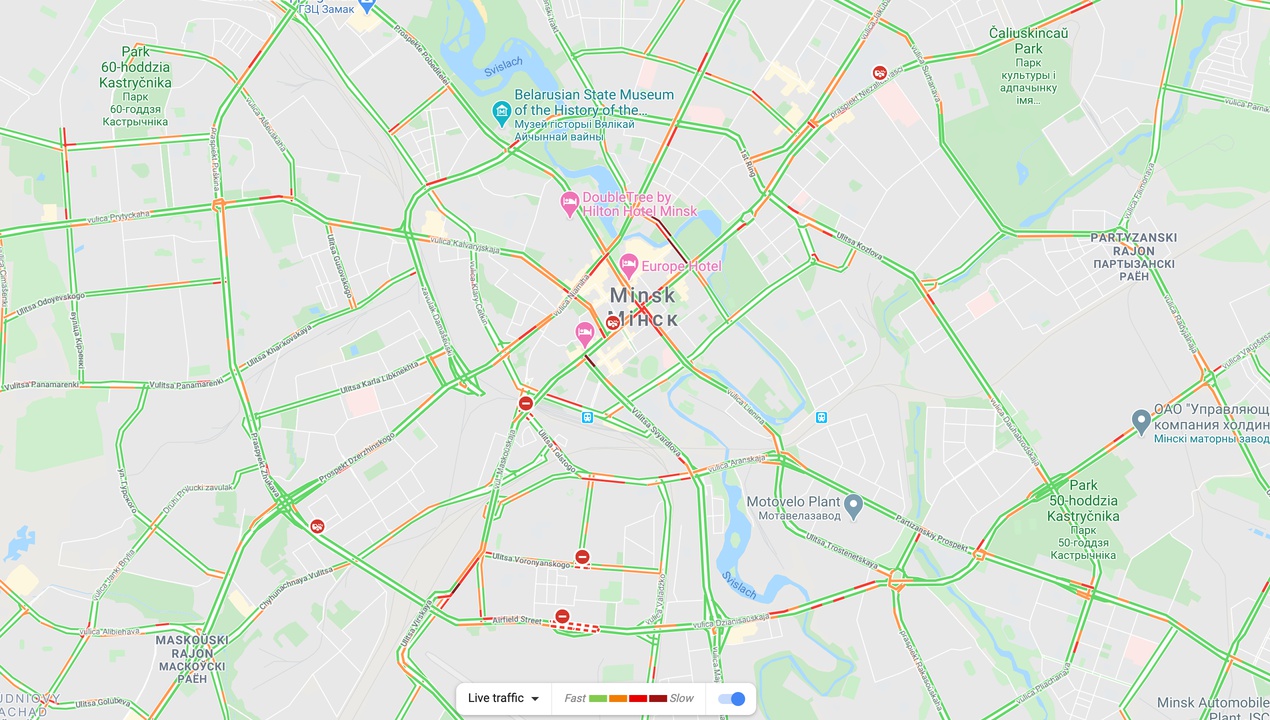 Сейчас, несмотря на то, что режим карантина в Минске официально не объявлен, транспортный поток в центр значительно снизился. Небольшие пробки остались лишь в самой оживленной части улицы Ленина, а Немига и проспект Независимости почти полностью свободны от заторов.