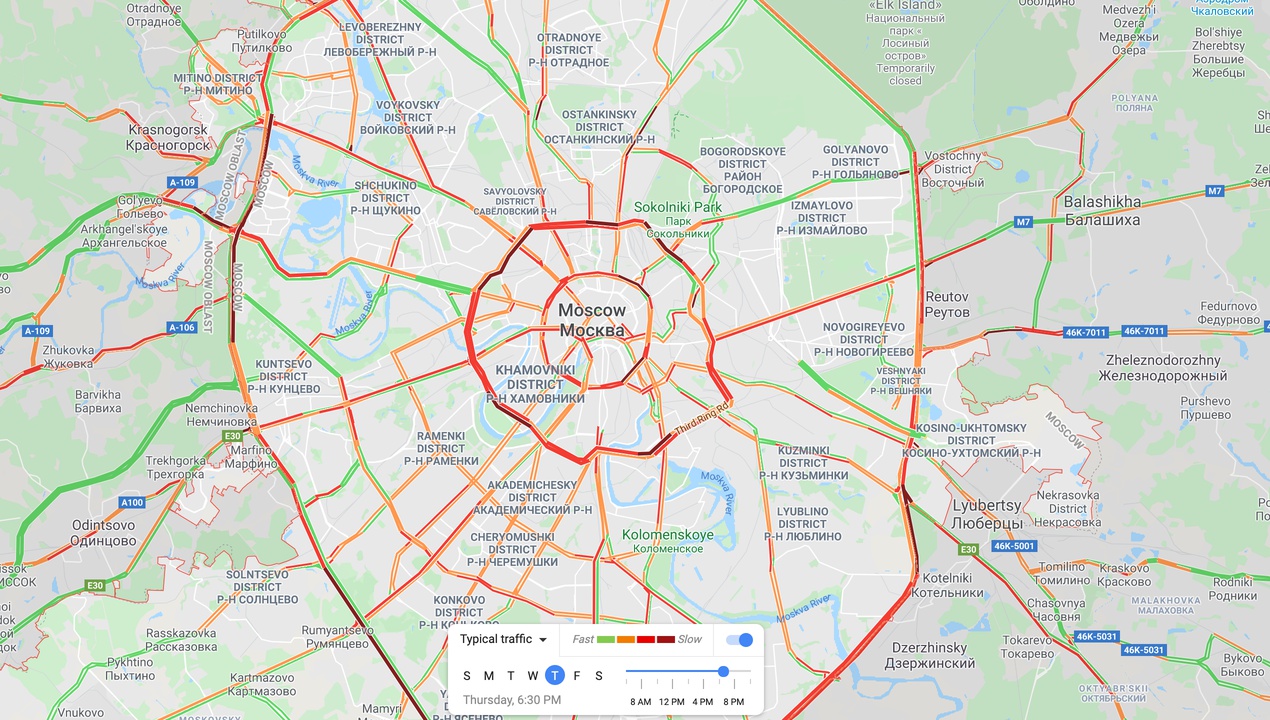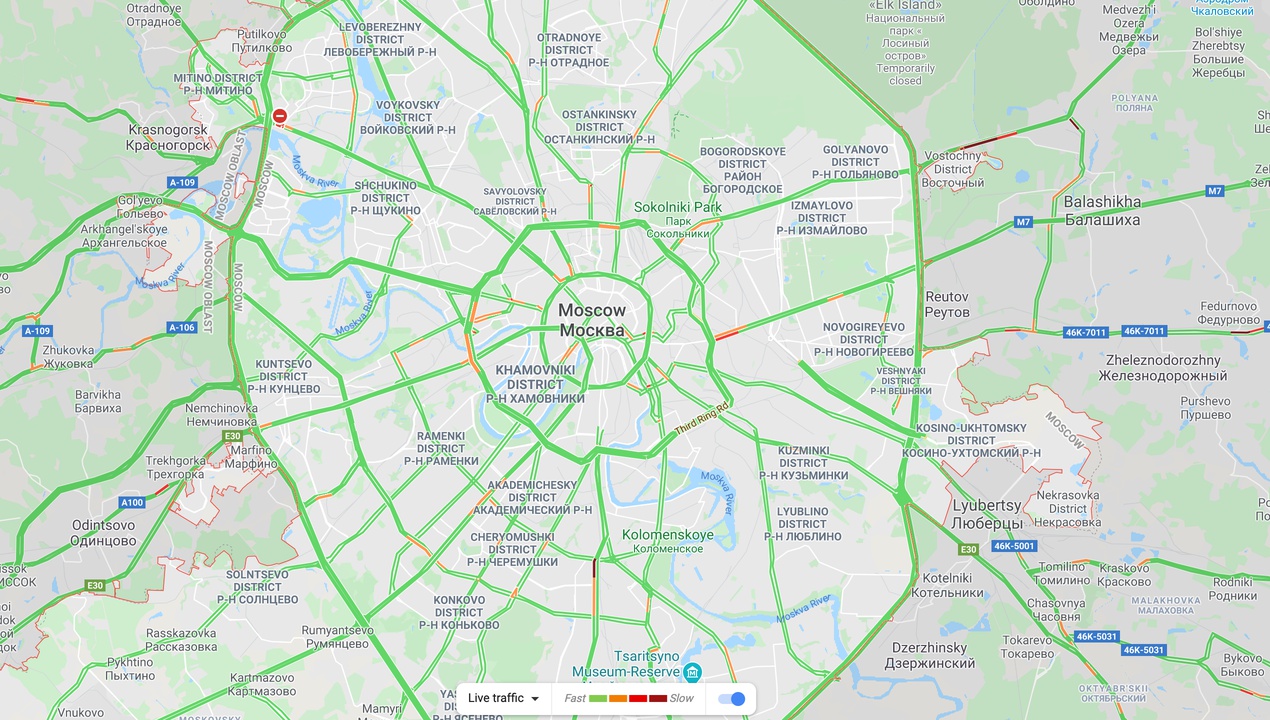 В Москве изменения автомобильного трафика особенно разительны. До введения карантина город каждый вечер стоял в пробке: движение было затруднено не только в центре и на трех городских кольцах (Садовом, Третьем транспортном кольце и МКАД), но и почти на всех радиальных дорогах из центра в область.