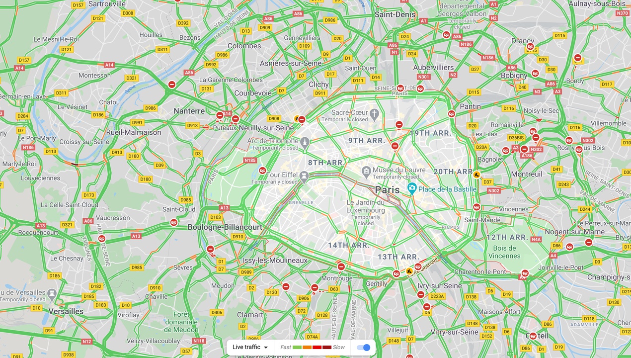 Париж входит в десятку самых загруженных городов мира (7-е место). Основная часть дорожных заторов скапливается на парижской окружной дороге – Переферик. Также один из самых проблемных участков в центре французской столицы – улочки вдоль Сены в районе собора Парижской Богоматери. Скопления туристов и туристических автобусов на набережных Монтбело и Жевр часто приводят к пробкам.