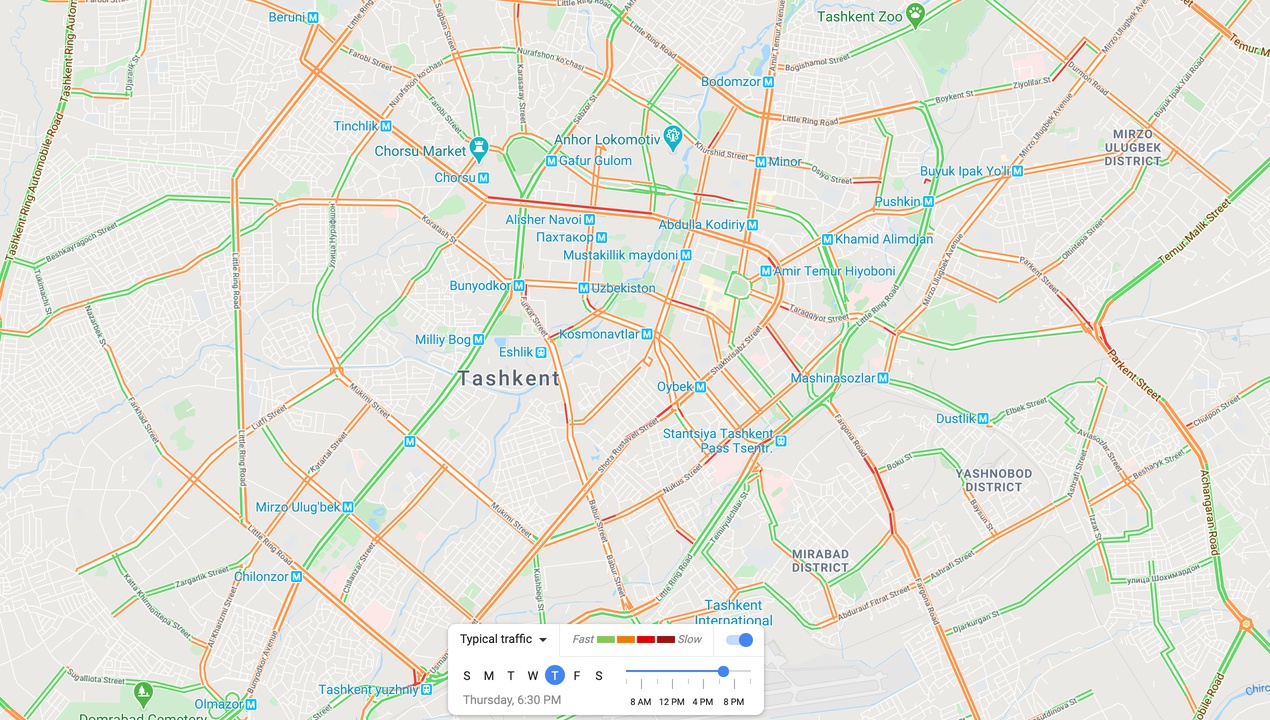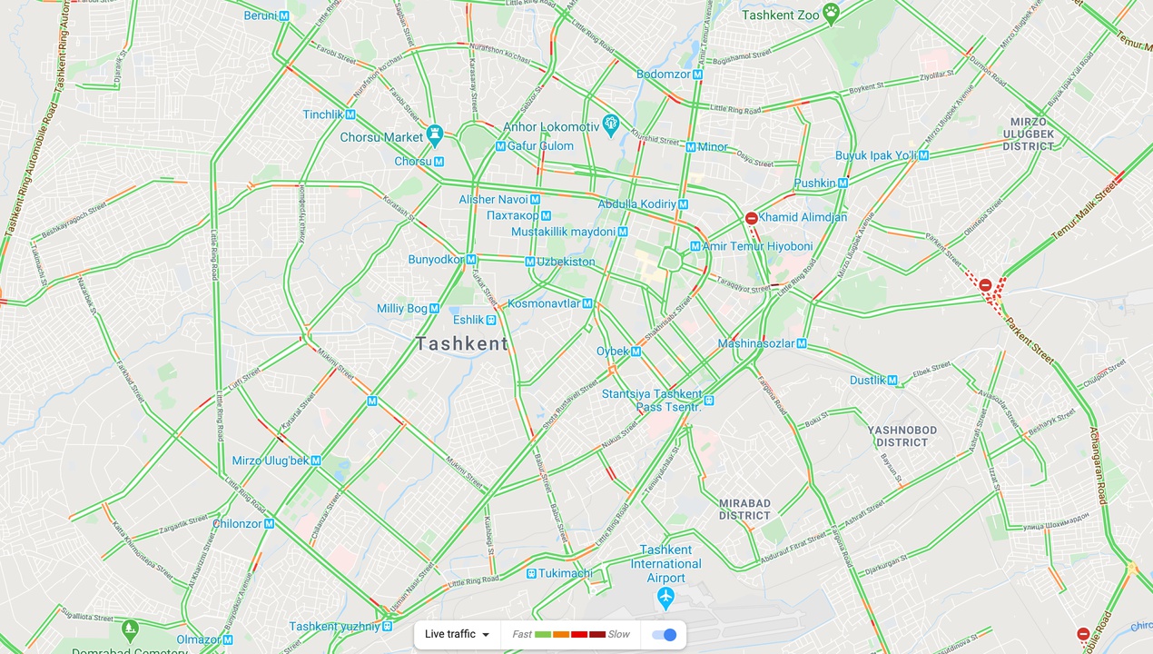 Введение ограничений на передвижение автотранспорта значительно разгрузило дороги в столице Узбекистана. По состоянию на вечер 16 апреля в городе практически не было участков с затрудненным движением.