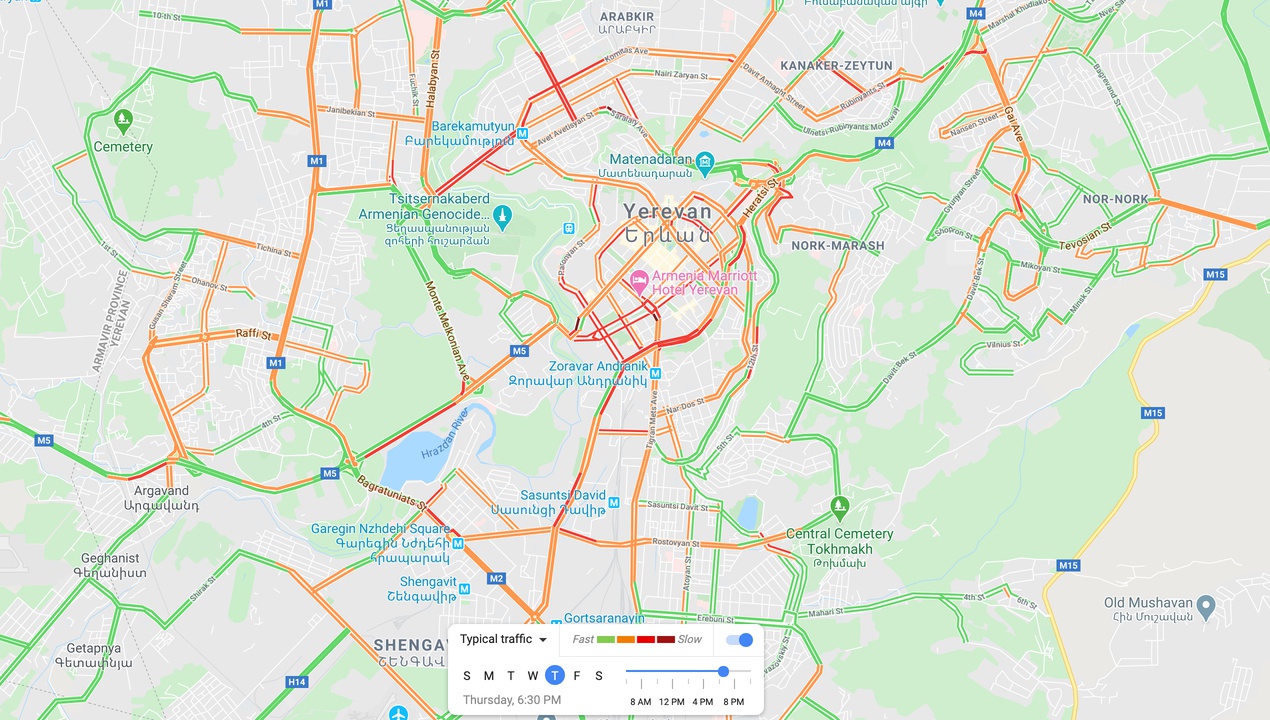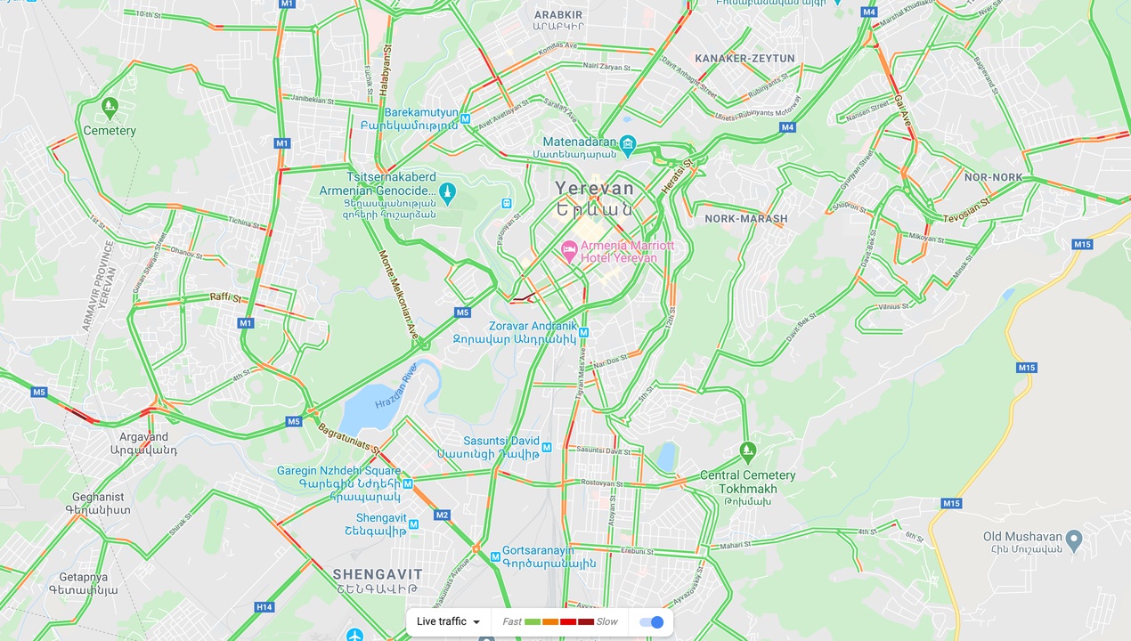 Наибольшие скопления машин приходятся на центр Еревана: в районе Кентрон, вблизи площади Республики и на улице Ханджяна, которая обрамляет исторический центр города. Введение ограничений на передвижение автомобилей удивительным образом решило проблему пробок в городе.
